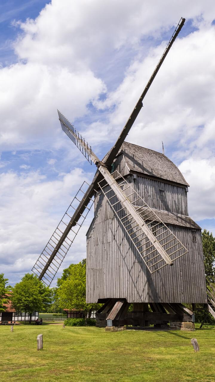 The mill, built in 1705 and named after its former owner, now stands in Stemwede in the district of Oppenwehe, having been moved there around 1870. On milling and baking days, guests can enjoy homemade cakes in rustic half-timbered barns.